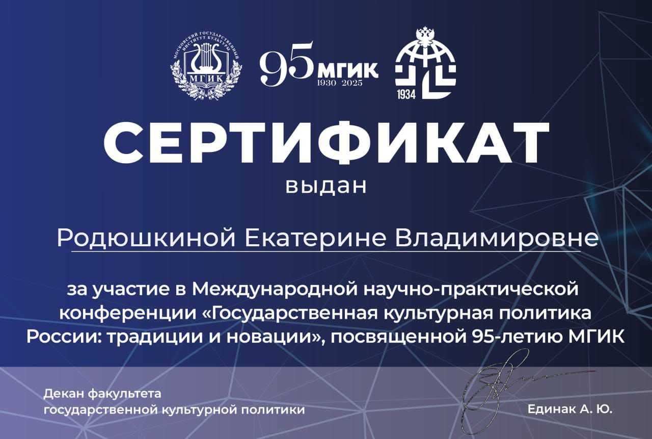 Декан экономического факультета АНО ВО «Гуманитарный институт» (г.Москва) Родюшкина Екатерина Владимировна приняла участие в Международной научно-практической конференции «Государственная культурная политика России: традиции и новации», посвященной 95-летию Московского государственного института культуры.