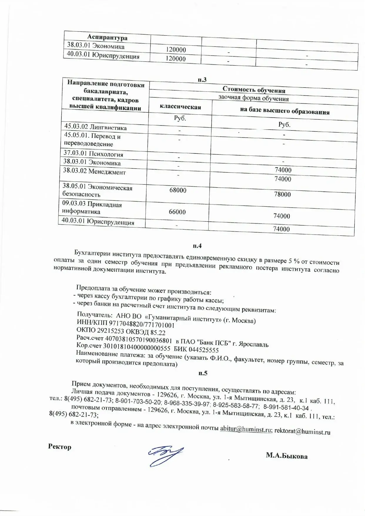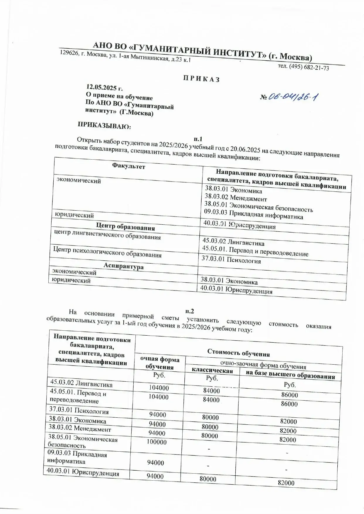 Скоро начнется приемная компания 2025 года. Публикуем приказ с актуальной стоимостью обучения по всем направлениям подготовки